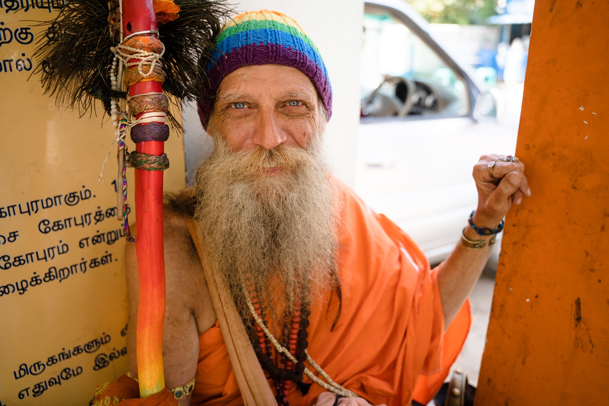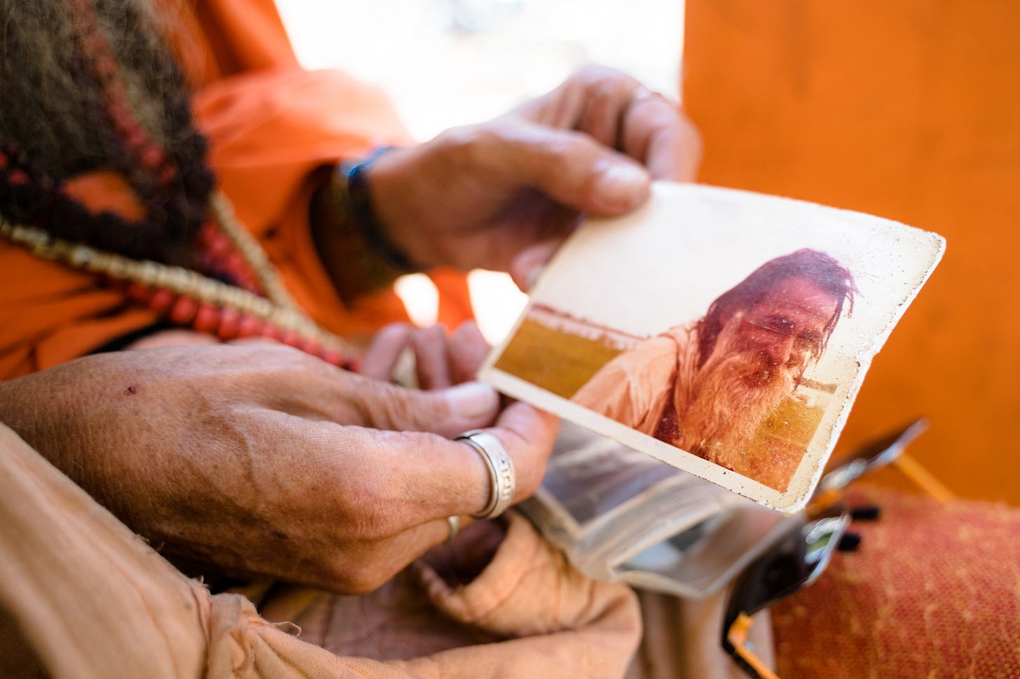 “Hi, I really like your hat. Can I take a photo of you?" He laughs, agrees, and poses for a photo. It's not a good shot, so I continue talking to him. He looks like any other sadhu living on the streets, but I notice that his accent is not Indian, so I ask him where he is from. “I'm from the US. I never thought I would end up living in Tiruvannamalai," he says. "I can definitely relate to that! Do you mind if I sit next to you?” I reply. He then proceeds to tell me the whole story of how he got here. His wife came to India in the '70s. While traveling, she met a mystic called Yogi Ramsuratkumar and became his student. After a few months here, she sent back a letter and a photo. "I remember I was sitting inside a Starbucks in California when I opened the envelope. When I read her words and saw that photo, I started crying." Out of a knitted pouch that was hanging around his neck, he takes a small ziplock plastic bag. He opens it and shows me the same photo that his wife sent him more than 40 years ago. He pauses for a moment, looking at the photo, and then continues. "It's one of the few photos that exist of Yogi Ramsuratkumar. When I first saw him, it was like seeing my father. All I wanted to do was to come to India and meet him. It was like a seed that started growing inside of me."
